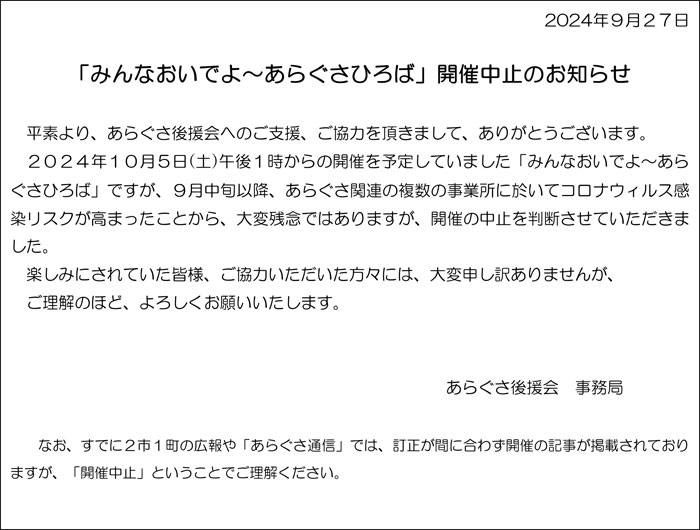「みんなおいでよ~あらぐさひろば」(10月5日予定)は開催中止になりました。